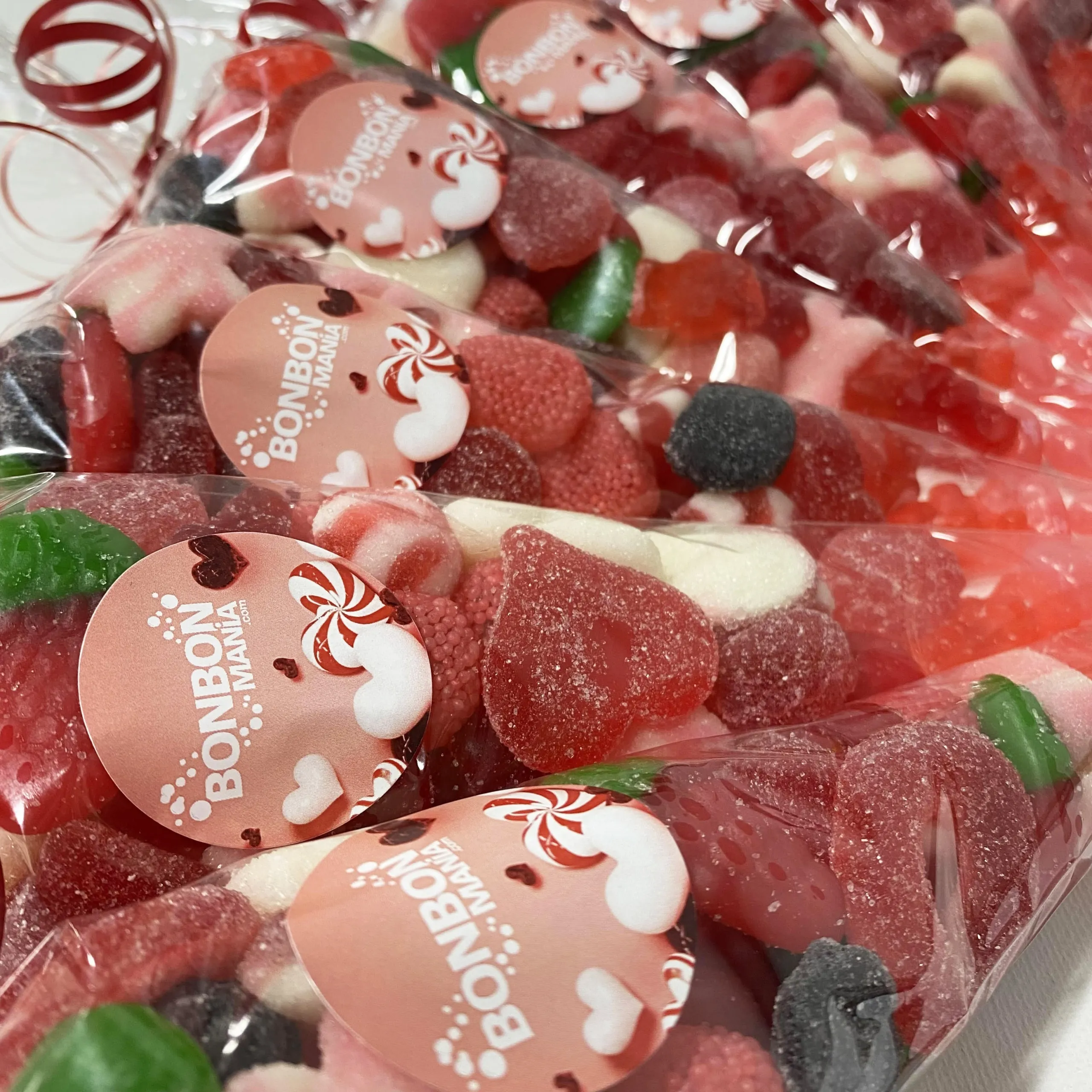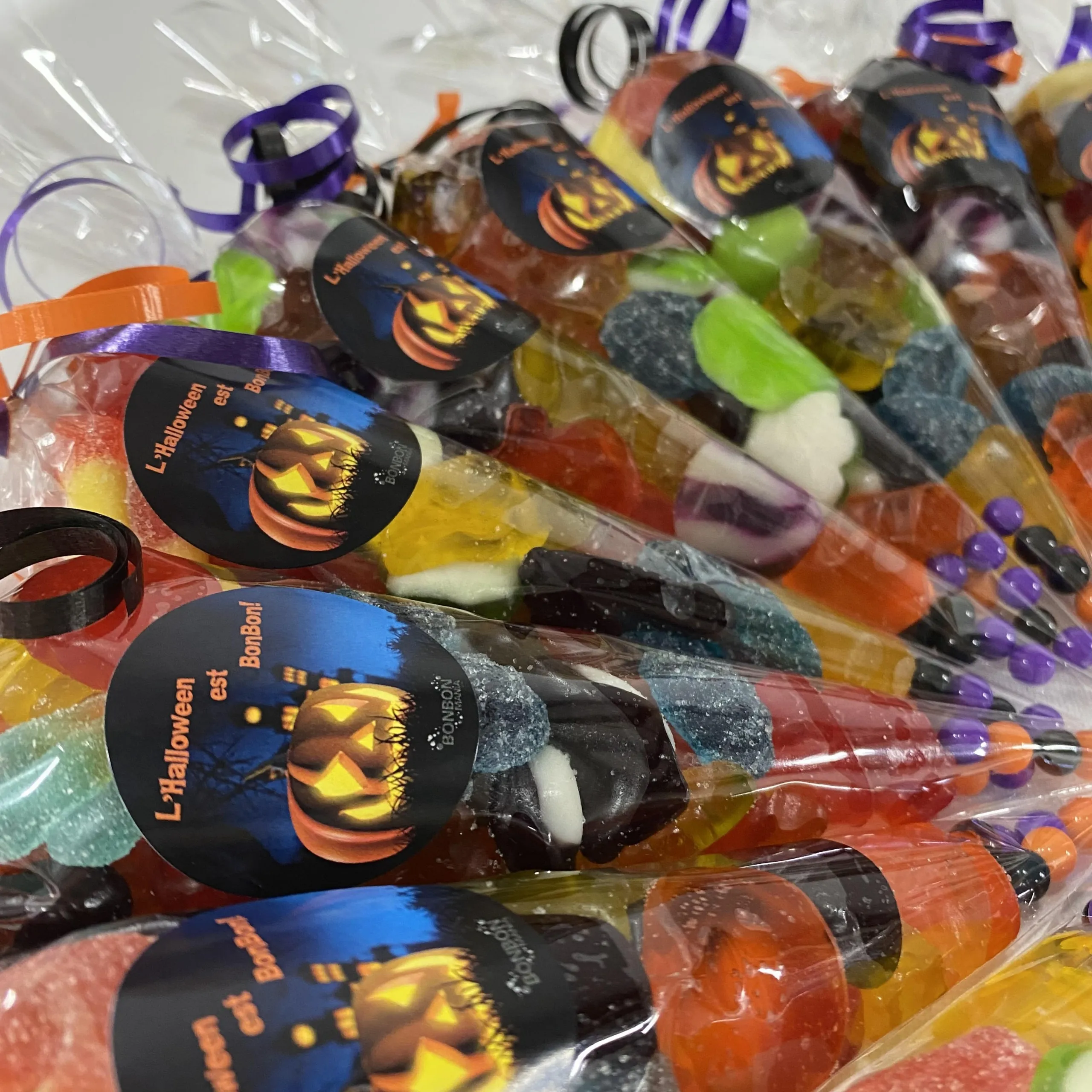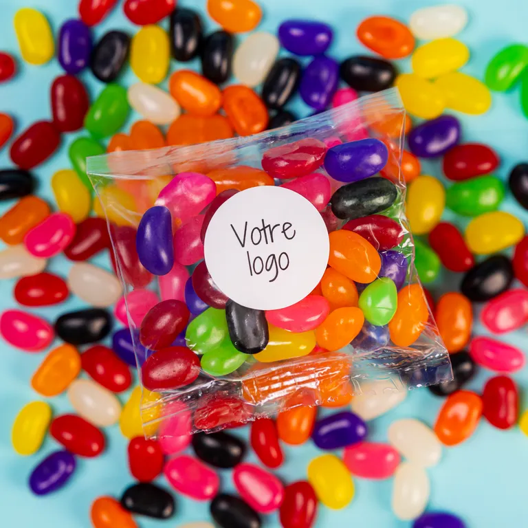 Sachet cello en forme de cône garni de 125g d’un mélange de bonbons dans les couleurs de votre choix.